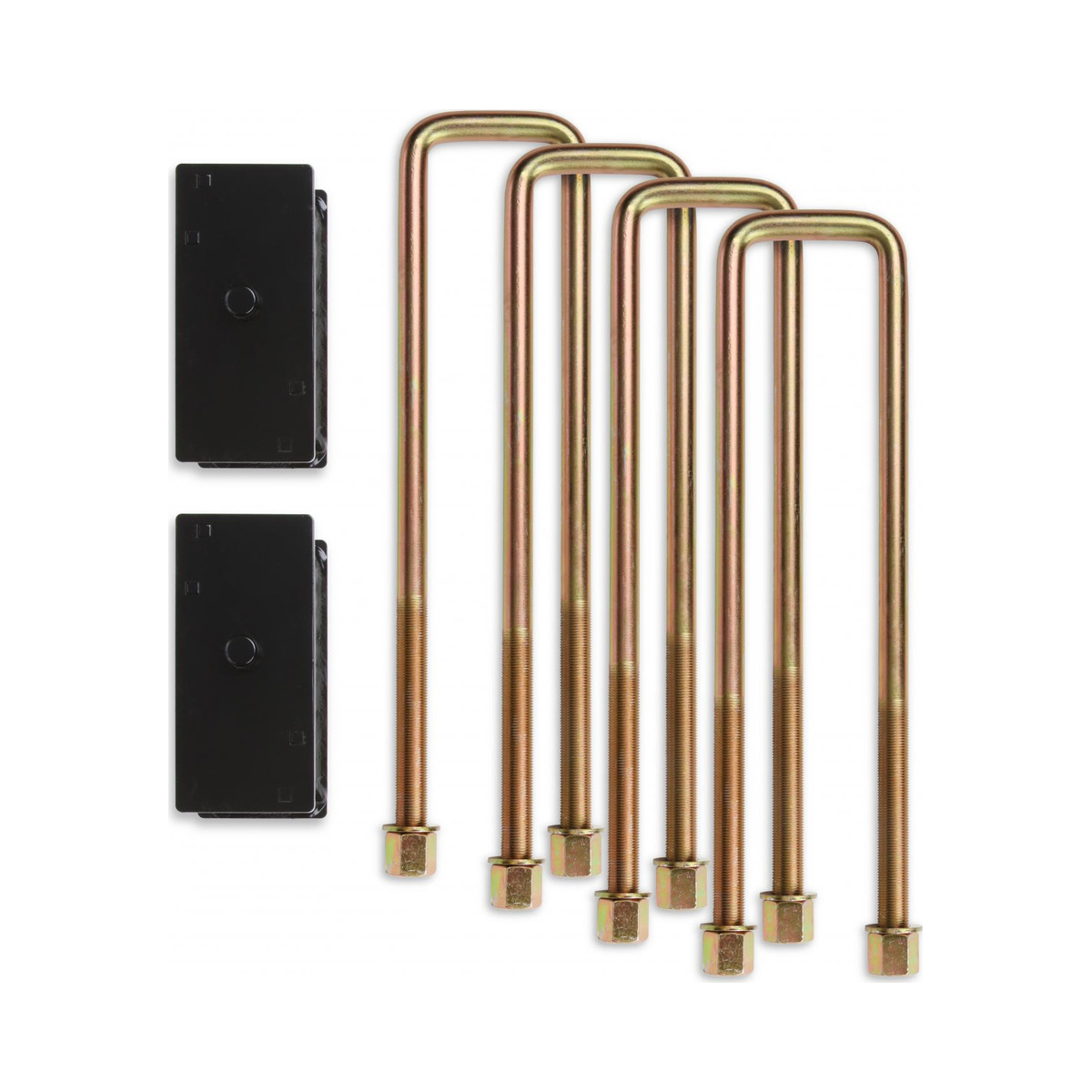 Cognito Fabricated Steel 3.5 Inch Block and 13 Inch U Bolt Kit (tapered) for 01-10 Chevrolet and GMC 1500HD/2500/2500HD 2WD/4WD trucks, 99-18 Chevy and GMC 1500 2WD/4WD trucks and 01-13 Chevy and GMC 2WD/4WD 2500 SUVs. These fabricated steel blocks are powder coated semi-gloss black. Heavy-duty zinc plated U Bolts and hardware are included. Made in the USA.