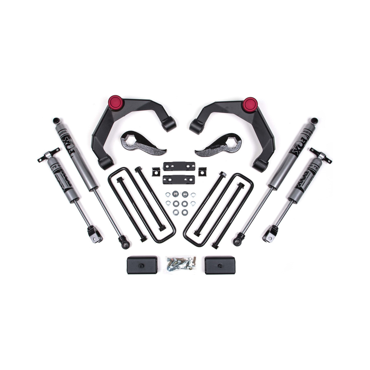 This kit includes steering knuckles, crossmembers, torsion bar brackets, front sway bar links, belly pan, brakeline brackets, bump stops, rear block kit and shocks. All required parts are included to make sure your Silverado or Sierra handles and performs just like a stock truck!