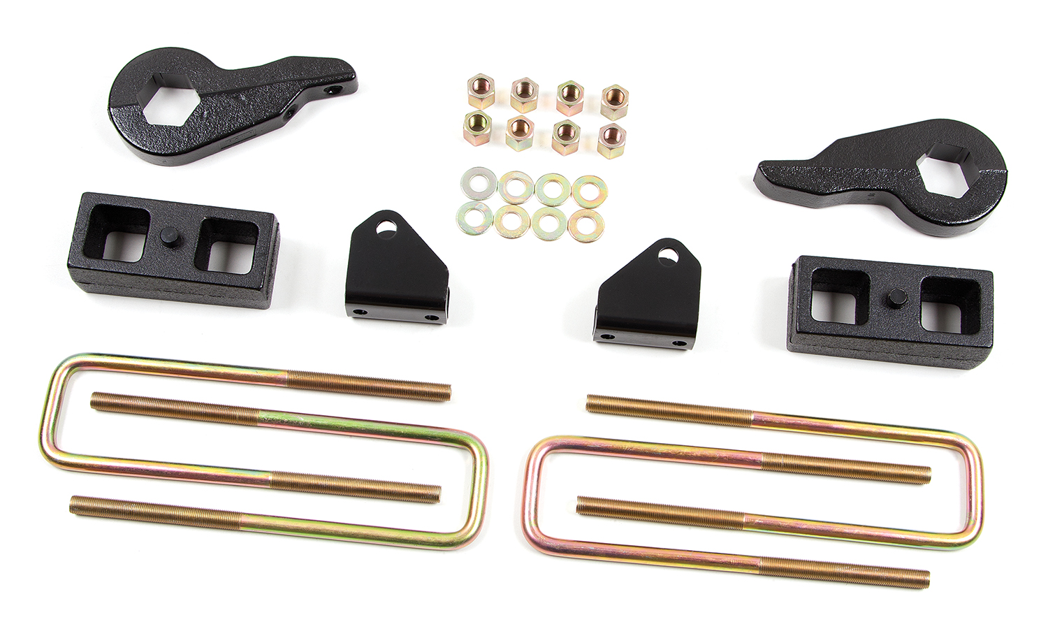 Complete 2″ Lift Kit! This Zone lift not only includes front torsion bar keys and a 2″ block & U-bolt kit, but it also includes front shock relocation brackets so your stock shocks can still be used. Zone Offroad torsion bar keys are made in the USA and are 100% resonant frequency tested to ensure a solid casting. Once tested the keys are CNC machined to ensure the proper amount of lift for your vehicle. Only Zone Offroad lists torsion key fitment based on the RPO codes of your truck listed in the glovebox to ensure the correct fitment. No more guessing of what color key might have been installed from the factory.These keys and rear blocks are designed lift the front and rear of your truck 2 inches and maintain the factory stance. Zone Offroad shocks are available as an option to complement your kit.