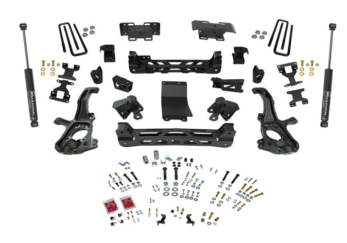 This kit includes steering knuckles, crossmembers, torsion bar brackets, front sway bar links, belly pan, brake line brackets, bump stops, rear block kit and shocks. All required parts are included to make sure your Silverado or Sierra handles and performs just like a stock truck!