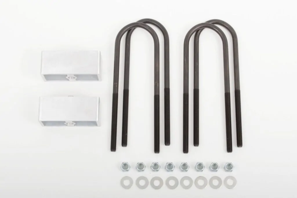 Kit Includes: (2) 2″ Rear Lowering Blocks, (4) U-Bolts, & Hardware