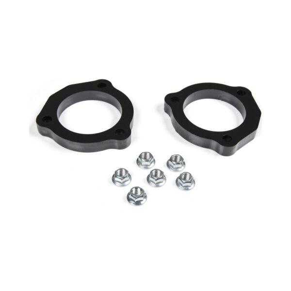 First to Market – Zone Offroad 1.25″ leveling kit. The strut spacers are laser cut from steel and e-coated for long lasting corrosion protection. This kit is completely bolt on and does not require disassembly of the factory strut. This is the maximum amount of “top spacer” these trucks can have and still properly work within the limits of the factory suspension.