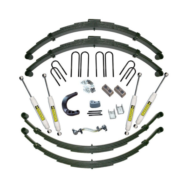 The 12″ lift system consists of Heavy Duty (HD) front leaf springs, durable Poly spring bushings, replacement front U-bolts, front sway bar brackets, a front driveshaft spacer, brake hose relocation brackets, rear brake hose, replacement rear leaf springs with Poly bushings, and a 3″ block and u-bolt kit for the rear. For steering correction a 4″ raised steering arm, a 4″ adjustable drag link, and a 3″ raised steering block are also included. The kit is packaged complete with Superlift Superide shocks.