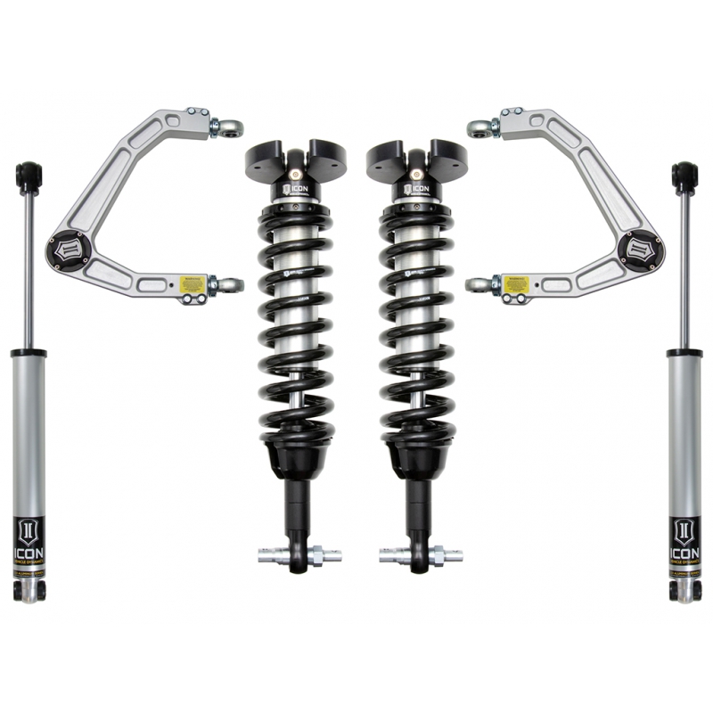 Summary: The ICON Stage 2 suspension system for the 2019–2023 Chevrolet Silverado and GMC Sierra 1500 is engineered to provide a significant increase in wheel travel and damping performance. This system features vehicle-specific tuned 2.5 Series front coilovers and 2.0 Aluminum Series rear shocks to deliver superior control on and off-road. A primary differentiator of this stage is the inclusion of CNC-machined 6061 billet aluminum upper control arms featuring the patented Delta Joint, allowing for on-vehicle camber/caster adjustment and improved suspension geometry.