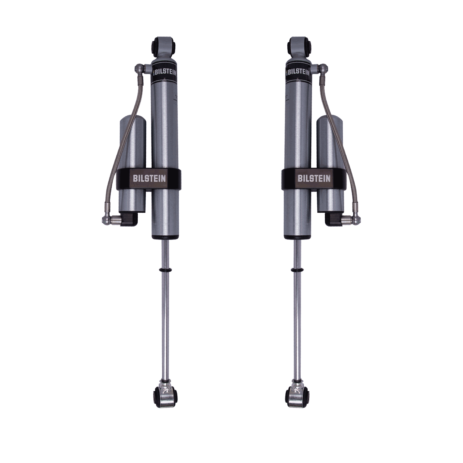 Bilstein B8 5160 remote reservoir shock absorbers are designed as a direct fit solution for lifted trucks and SUVs. The remote reservoir will offer increased cooling capacity and wheel travel to optimize overall performance compared to a traditional shock absorber. These shock absorbers feature a monotube design for consistent fade free performance and utilize velocity sensitive digressive valve settings which are tuned for each specific application. Each shock absorber is fitted with a unique 360 degree swivel banjo hose fitting and an attractive billet reservoir mount where applicable providing a clean, low profile installation. B8 5160 remote reservoir shock absorbers will increase overall durability of your vehicle allowing you to conquer the harshest of off-road environments.