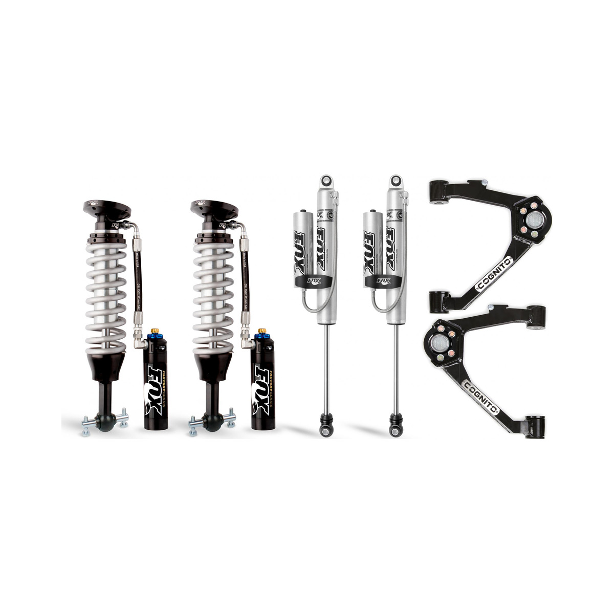 We have bundled everything you need in a leveling kit for your Silverado/Sierra 1500 2WD/4WD with high quality Cognito components. There is no guesswork. Cognito components are engineered, manufactured, and assembled in the USA. The Cognito 3-inch Elite Leveling Kit includes the Cognito Ball Joint SM Series Upper Control Arm Kit, Fox 2.5 FSCO Front Coilover Shocks, and Fox 2.0 Performance Series Remote Reservoir Rear Shocks.