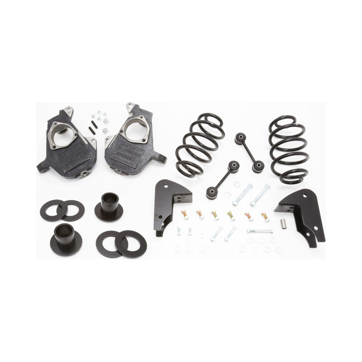 Kit Includes: (2) Front Drop Spindles, (2) Front Drop Strut Cups, (4) Strut Cup Spacers, (2) Rear Drop Coils, (2) Rear Sway Bar Link Ends, (2) Rear Trailing Arm Drop Brackets, & Hardware