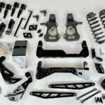 Kit Includes: (2) Spindles, (1) Front Crossmember, (1) Rear Crossmember, (2) Compression Struts, (2) Rear Trailing Arm Relocators, (1) Skid Plate, (2) Front Brake Line Extenders, (2) Tie Rod Ends,  (2) Sway Bar Extenders, (2) Rear Coil Springs, (1) Track Bar Relocator Bracket w/ Support, (2) Rear Shock Extenders, (2) Lower A-Frame Support Rods, (2) Rear Bump Stop Extenders, (1) Wheel Spacer, (2) Re-Enforcement Plates, (2) Compression Strut Brackets, (4) Upper Clam Shell Strut Extenders, (4) Billet Pucks, (2) Lower Strut Extenders, (2) Ride Height Sensor Extenders