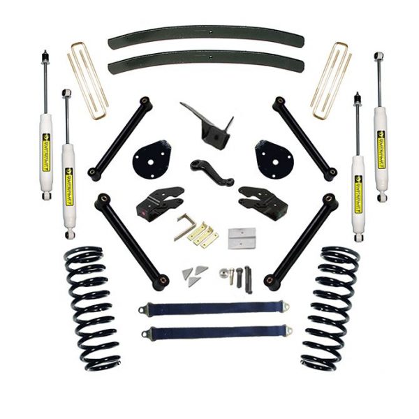 Front lift is via new, pre-set coil springs. A dropped pitman arm, for steering correction, works in concert with our track bar relocation bracket to ensure proper phasing. New upper/lower front axle-to-frame link arms restore factory alignment specifications. Front/rear suspension compression travel control is also addressed.