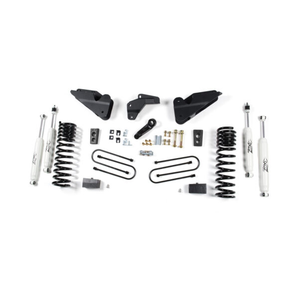Zone Offroad 2013-17 Ram 3500 (Gas, Including 6.4L) 4″ Suspension System. This new lift system utilizes heavy duty drop brackets to relocate the new factory Ram radius arms. The new relocation brackets tie into the factory radius arm mounts as well as additional support to the frame. This relocation corrects the suspension geometry to compensate for the 4″ of lift provided by the progressive rate coil springs.