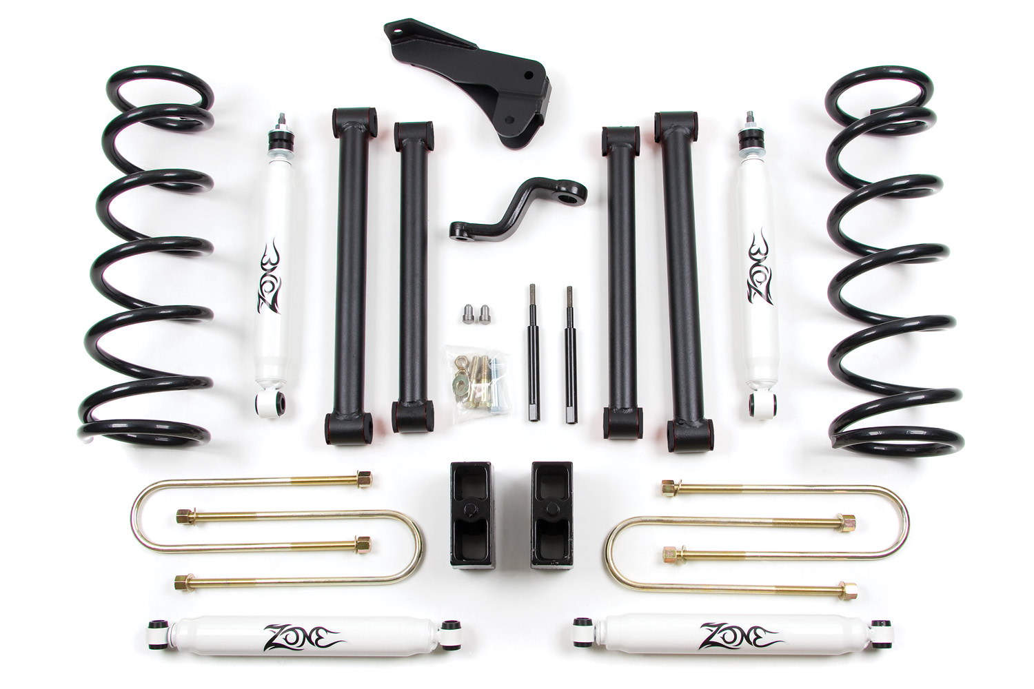 This Zone Offroad 4-link system replaces the weak upper and lower factory control arms with greasable DOM tubular arms. the arms mount in the factory control arm pockets for a completely bolt on easy installation that aligns to factory specs. Zone Offroad has engineered their coil springs for a comfortable ride on both gas and diesel trucks. Custom valved hydraulic shocks are included for a great ride, or choose the black nitrogen gas charges shock for that performance handling feel. To correct the steering geometry