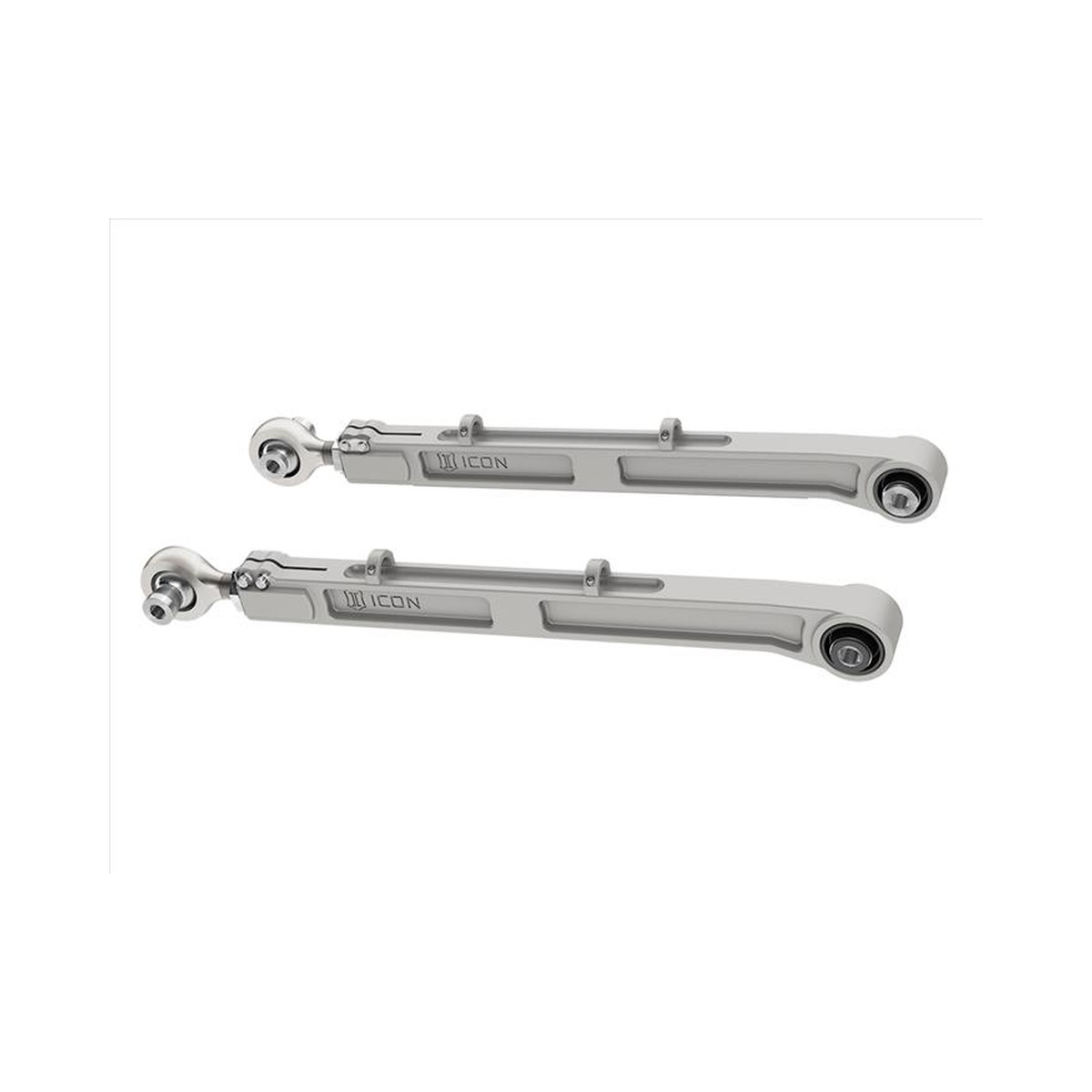 CON’s billet aluminum rear lower link arms for the 2021-UP Ford Bronco are a significant upgrade over the factory units due to increases in strength, adjustability, and performance. These links are made from CNC machined 6061 aluminum in-house and anodized for corrosion resistance, providing a major improvement over the construction of the stock units. This rear lower link arm kit features PTFE-lined FK rod ends for increased suspension articulation, reduced deflection, and on-vehicle link arm length adjustability using ICON’s double adjuster system. Additionally, multi durometer bushings are installed that allow for noise free operation and maximum angularity without the need for periodic greasing and/or other maintenance. The quality rod ends and bushings featured in these link arms allow the vehicle’s suspension to function as intended, without the bushing bind that limits the vehicle in stock form. ICON’s engineering team has also gone a step further in the development of these products by incorporating features such replaceable nylon rock sliders to prevent any hang-ups on the trail. After the design phase was completed ICON engineers put these parts through the “ICON1K” real-world test cycle for a final stamp of approval.