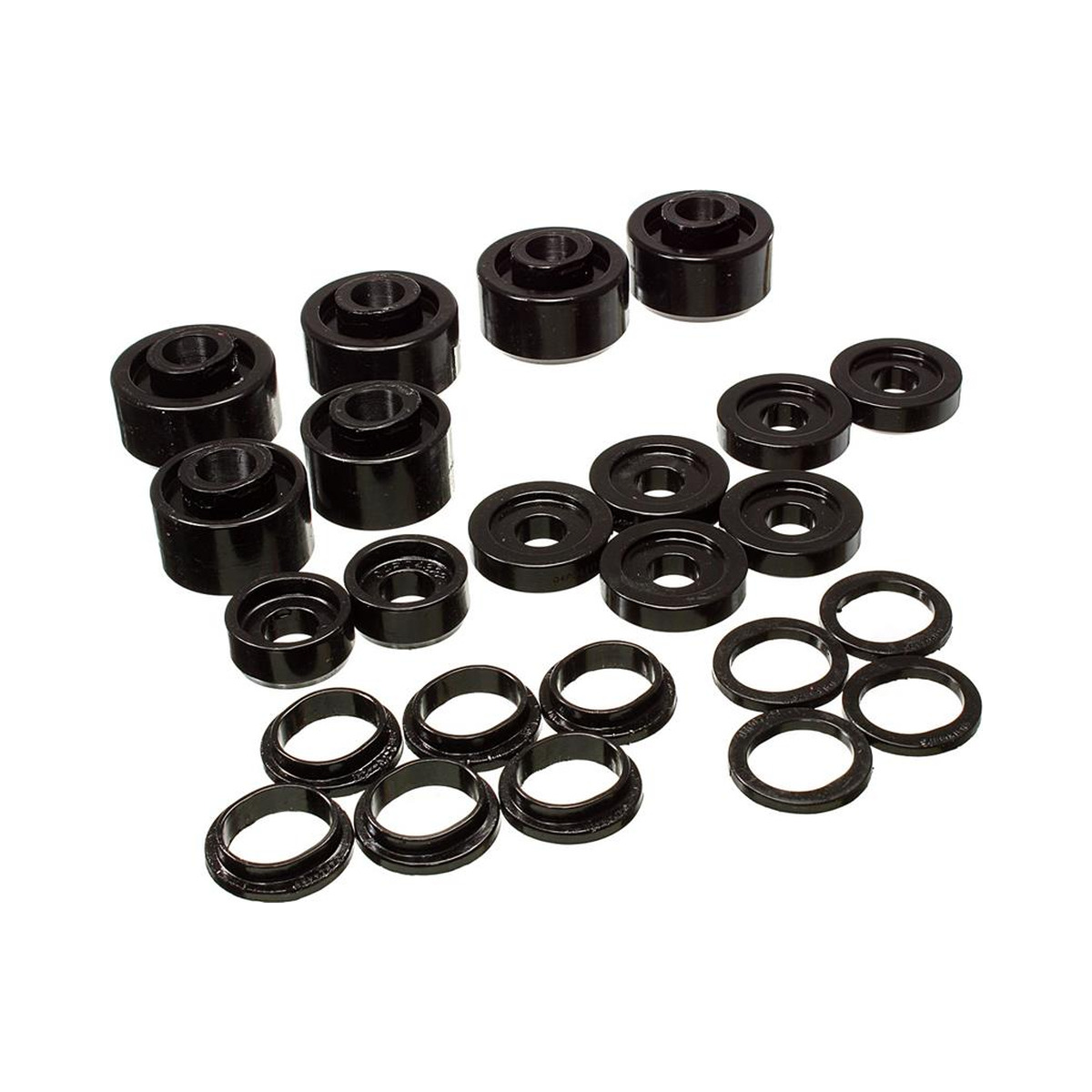 The Energy Suspension Body Mount Set fits 2002-2007 Ford F-550 Super Duty. Key configuration details include Black Hyper-Flex performance polyurethane construction. It is designed to restore body-to-frame alignment with greater durability than stock rubber mounts.