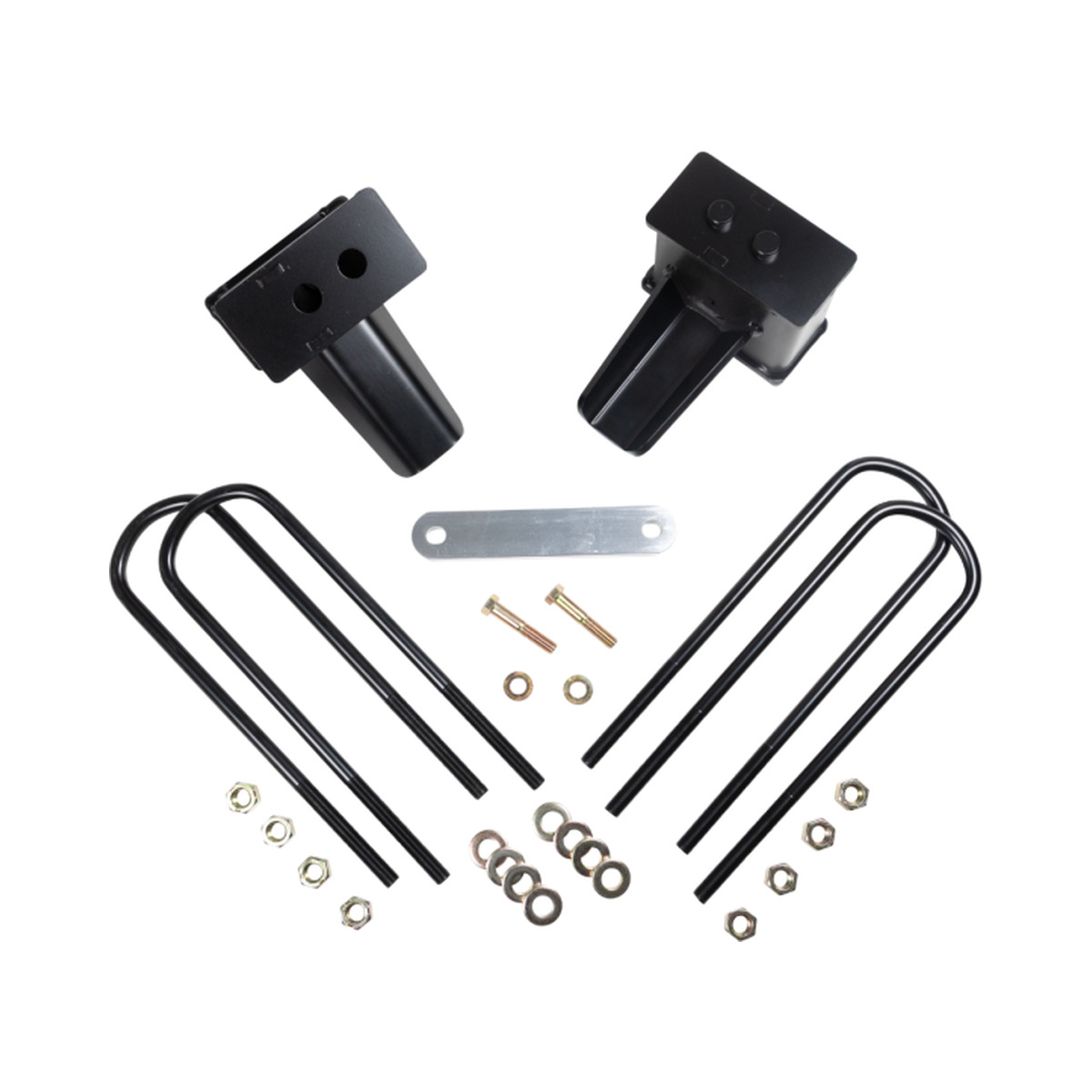 ReadyLIFT’s Ford F-150 OEM style 4″ Rear Block Kits are now available for 2021-2025 Ford F150 2WD/4WD applications. These Rear Block Kits include two (2) 4″ Tall Rear Blocks, four (4) E-Coated U-Bolts, eight (8) Nuts and Washers and will safely lift the rear of your 2021-2025 Ford F-150 Truck. Create more rake with the addition of this 4″ tall rear block kit. Ideal for when more rear lift is required for towing or hauling. Based on OEM designs and never made out of lightweight extrusions, our 4″ Ford F-150 Blocks have Integrated OEM Style Bump Stop Landings and cast-in center pins. ReadyLIFT Block Kits will put a slight rake back in your truck for hauling or towing and are designed to work in concert with your ReadyLIFT Suspension Leveling Kit. In fact, these blocks are the ideal Tow Package upgrade for not only for stock height vehicles but lifted or leveled trucks too. Like all ReadyLIFT products, these block kits come with our Limited Lifetime Warranty. With this new Rear Lift Block, you will never have to illegally stack rear blocks again!