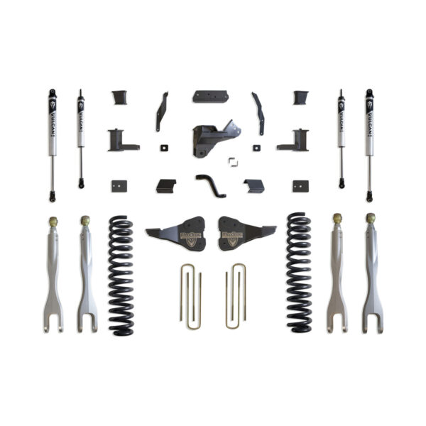 The kit includes essential components such as diesel coils, radius arm brackets, a trac bar bracket, sway bar brackets, bump stop extensions, a pitman arm, brake line brackets, blocks, U-bolts, and front/rear Vulcan Series shocks, ensuring a complete setup for enhanced performance. This lift kit is compatible with 17″ rims or larger, featuring a backspacing of 5.5″ or less, making it ideal for custom wheel setups.