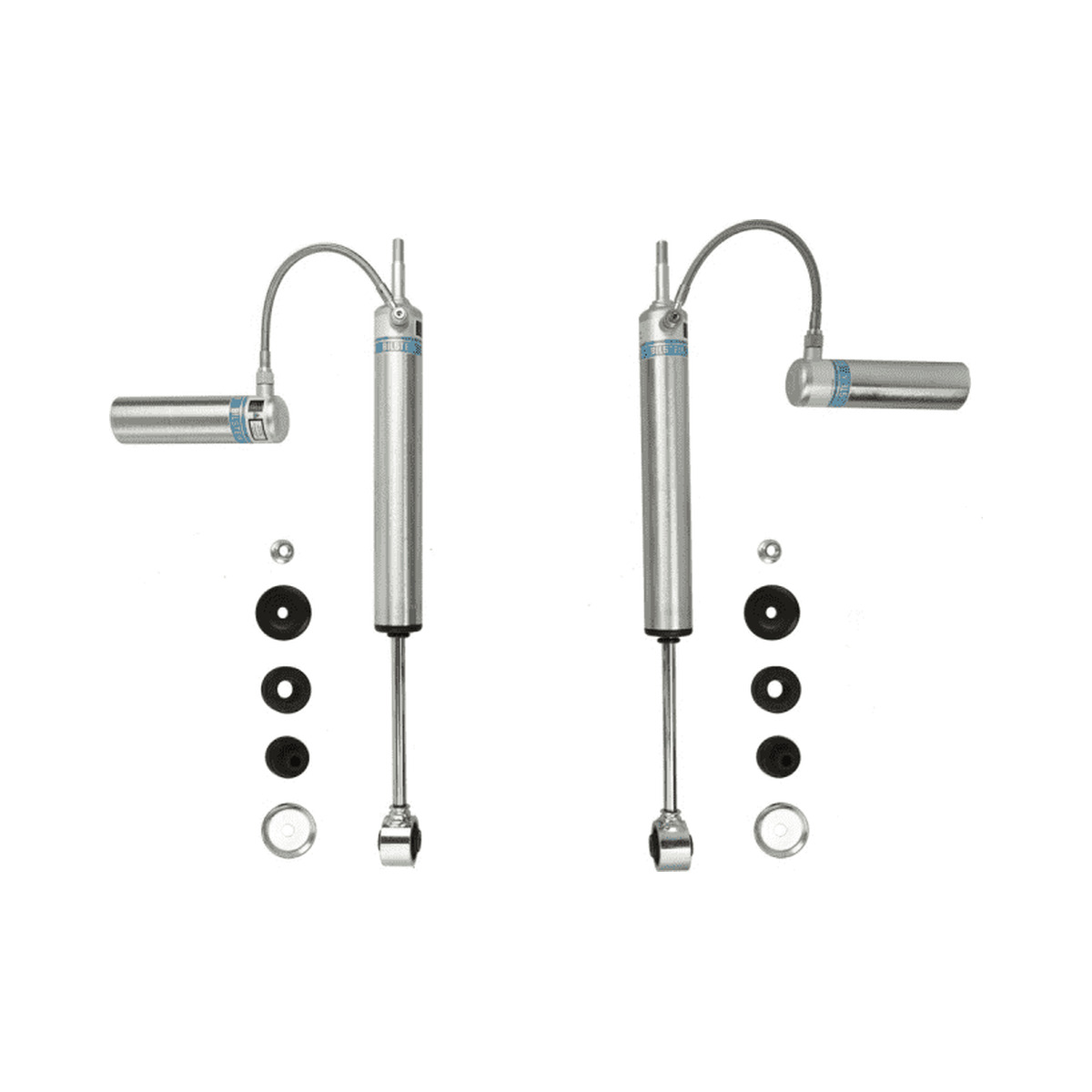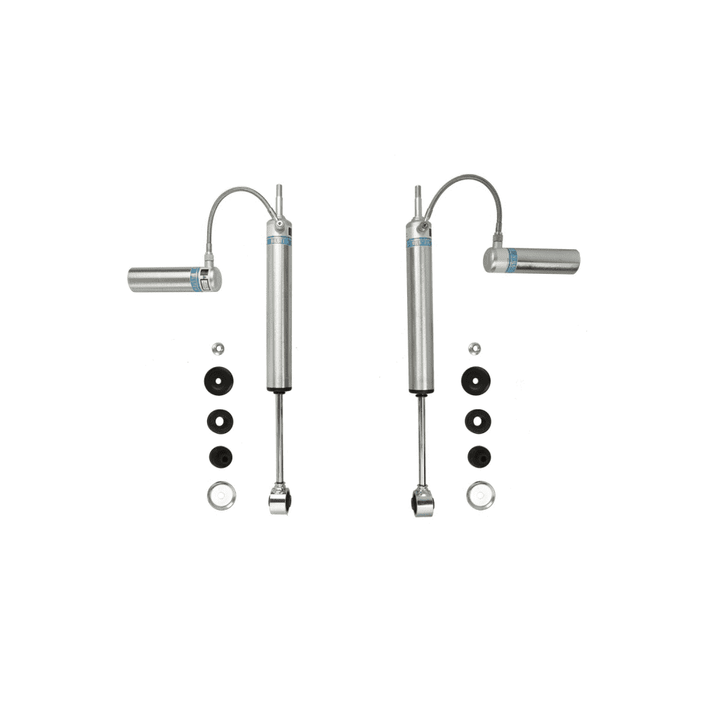 Bilstein B8 5160 remote reservoir shock absorbers are designed as a direct fit solution for lifted trucks and SUV’s. The remote reservoir will offer increased cooling capacity and wheel travel to optimize overall performance compared to a traditional shock absorber. These shock absorbers feature a monotube design for consistent fade free performance and utilize velocity sensitive digressive valve settings which are tuned for each specific application. Each shock absorber is fitted with a unique 360 degree swivel banjo hose fitting, providing a clean, low profile installation. B8 5160 remote reservoir shock absorbers will increase overall durability of your vehicle allowing you to conquer the harshest of off-road environments.