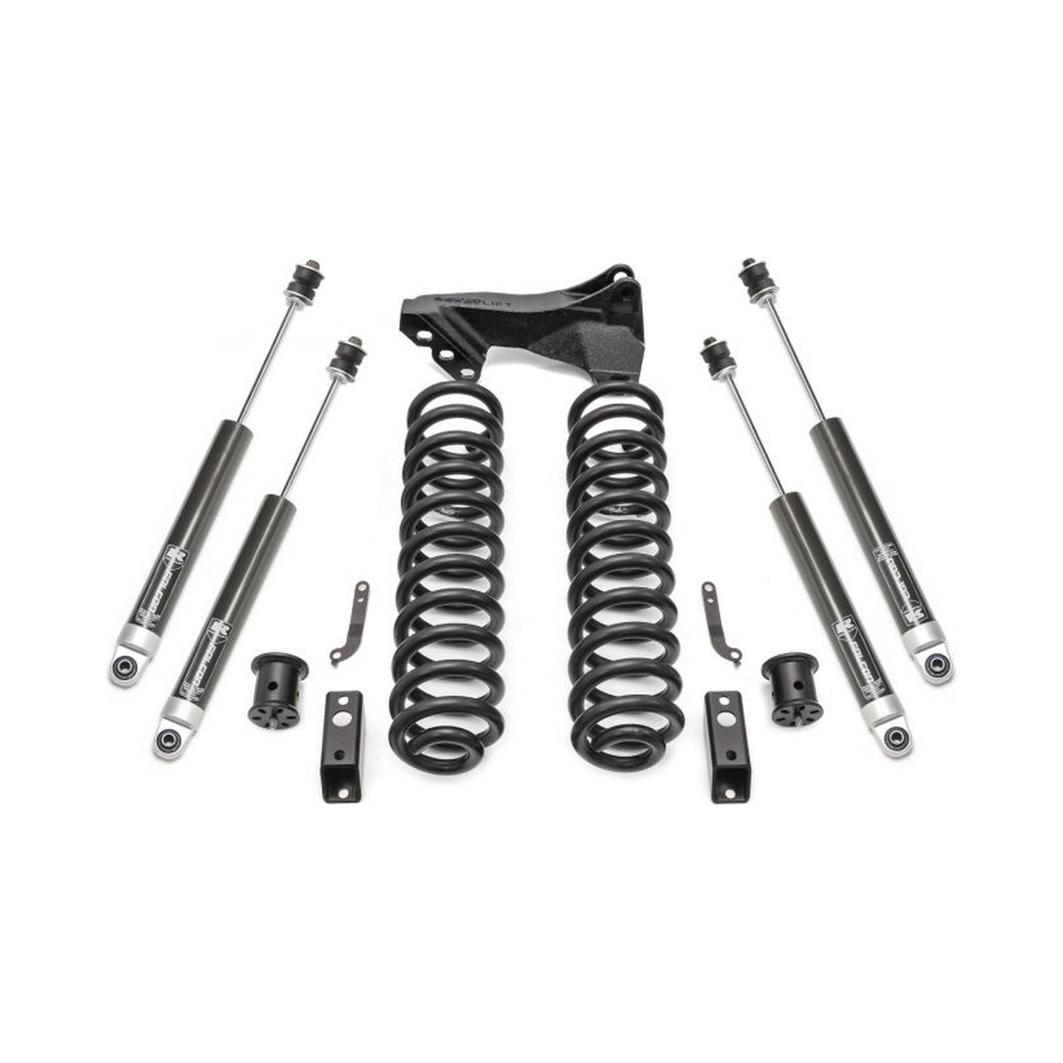 This kit includes front and rear Falcon 1.1 Monotube series shocks and our popular front track bar relocation bracket. This gives Super Duty owners an excellent alternative for lifting the front of your truck. This great new front leveling system will raise the front of your 2017-2019 4WD Super Duty truck 2.5″ while including added value components such as the premiere Falcon 1.1 Monotube shocks and our track bar relocation bracket.. The 46-2724 coil spring system allows for increased tire sizes and widths along with providing improved ground clearance and a more commanding view of the road.