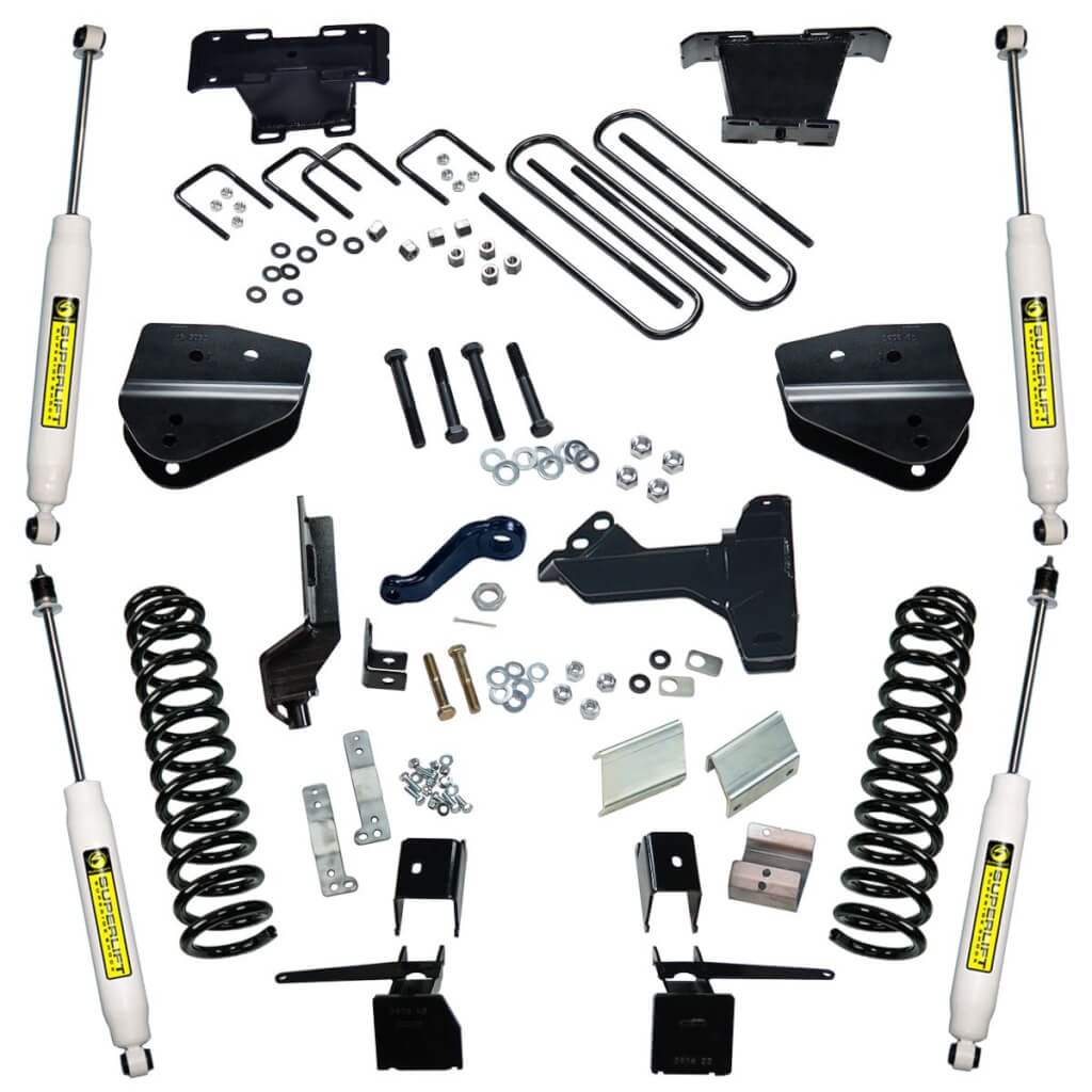 The 6″ lift for the 2017-2018 Ford Super Duty 4WD is achieved via engine specific coil springs to ensure proper lift height and maintain factory ride quality. Radius arm lowering brackets are used to restore proper caster angle / alignment. Other components included with the 6″ system are: front compression travel-stop relocation brackets, track bar relocation bracket, drop pitman arm, and a steering stabilizer bracket. The rear lift is achieved with a new design fabricated rear block that allows the removal of the stock block. The kit is packaged complete with Superlift Superide or Superide SS shocks by Bilstein.