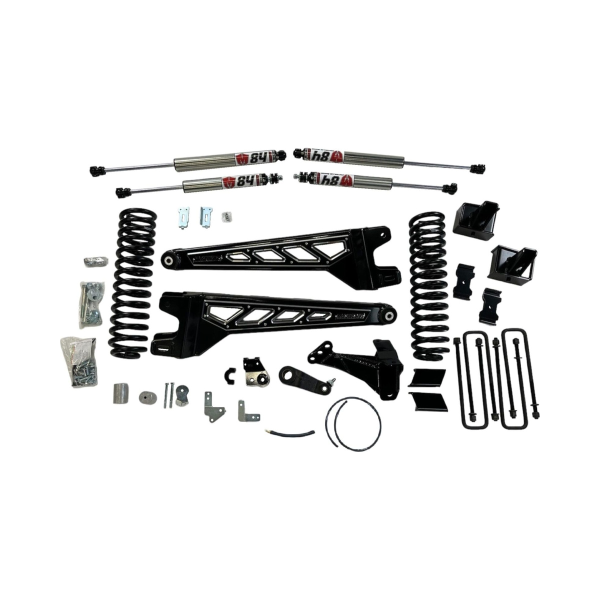 Kit Includes: (2) Radius Arms w/ SS Inserts, (2) Radius Arm Billet Face Plates, (2) Radius Arm Auto-Leveling Brackets, (2) Front McGaughy’s M84 Controlled Shocks, (2) Rear McGaughy’s M84 Controlled Shocks, (2) Front Dual Rate Soft Ride Lift Coils, (2) Rear 4.5″ Lift Blocks, (2) U-Bolt Retainer Plates, (2) Front Bump Stop Extensions, (1) Bump Stop Brake Line Bracket, (2) Front Brake Line Extension Brackets, (1) Drag Link Flip Bracket Kit, (1) Drop Pitman Arm, (1) Front Track Bar Drop Bracket, (2) Front Sway Bar Drop Brackets, (4) U-Bolts, & All Hardware