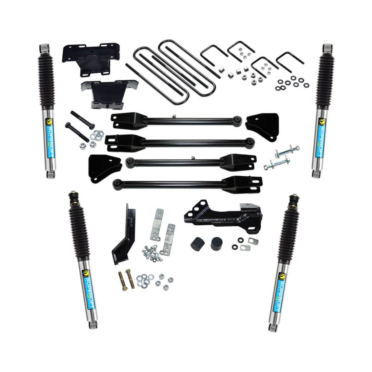 This is a 4″ lift kit with a 4-Link conversion for a 2017-2021 Ford F-250 and F-350 Super Duty 4WD with Bilstein Shocks.