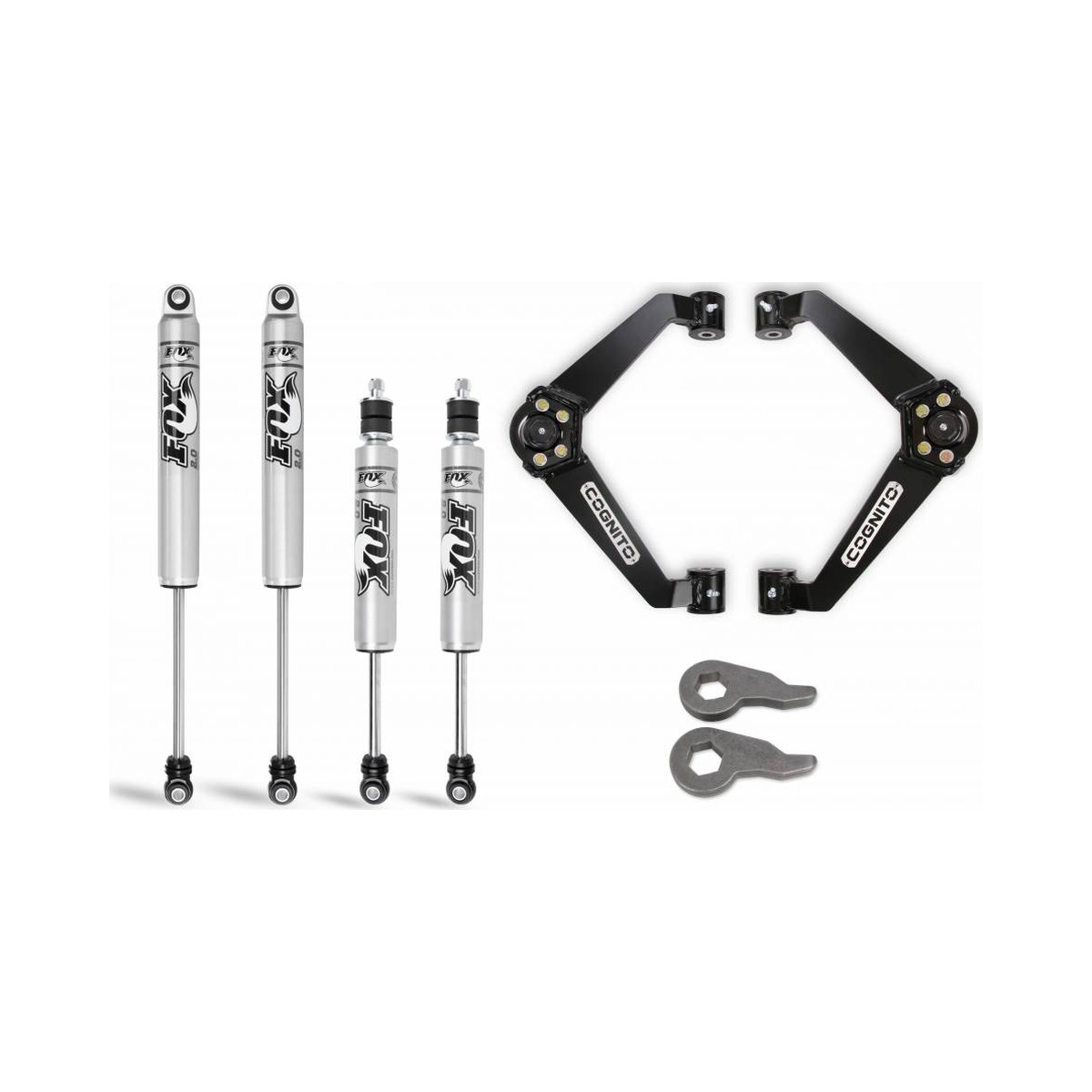 The Cognito 3 Inch Performance Leveling Kit for 01-10 GM 1500HD/2500/2500HD/3500/3500HD includes the Cognito Ball Joint SM Series Upper Control Arm Kit, Torsion Bar Adjuster Keys, front and rear Fox Performance Series Monotube shocks and front shock spacers to maximize droop travel.