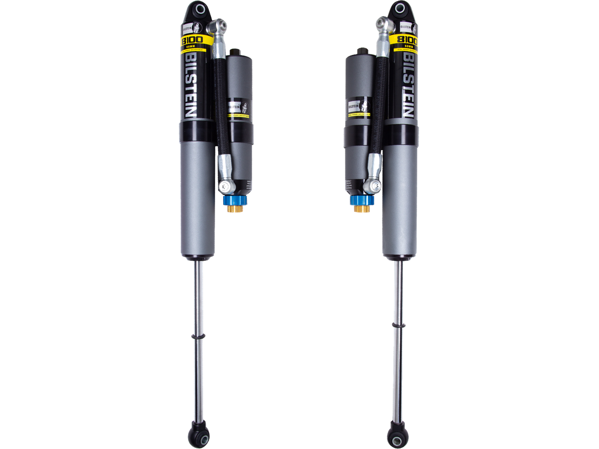 The Bilstein B8 8100 (DSA) reservoir shock absorber is an adjustable large bore 60mm direct fit solution for lifted trucks and SUVs. Constructed from aerospace quality billet components, the large 60mm ID shock body offers a higher oil volume capacity to control heat while tackling rough road surfaces over long distances. Click adjuster knobs allow easy and precise Dual Speed Adjustment of both low and high speed compression to tailor your ride to any surface. Each B8 8100 (DSA) offers a unique remote or piggyback reservoir solution for an easy, hassle free installation. These shock absorbers feature a monotube design for consistent fade free performance and utilize velocity sensitive digressive valve settings which are tuned for each specific application. The large 60mm piston design offers more comfort and control in all driving conditions. The Bilstein B8 8100 (DSA) will allow you to tame the terrain in comfort.