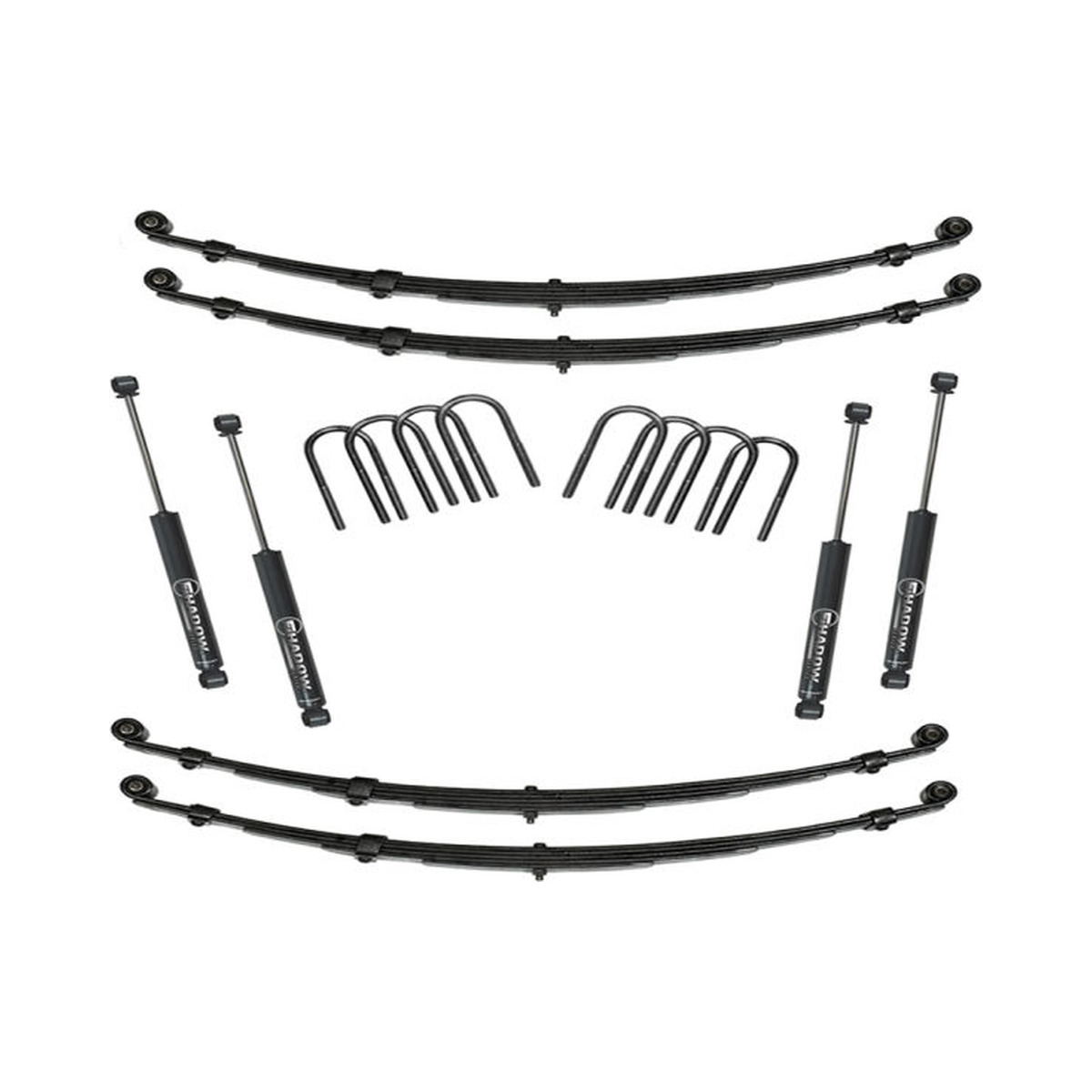Front: Superlift leaf springs (2); U-bolts (4); heavy-duty flat washers (8); U-bolt long nuts (8); polyurethane bushings (8) & metal sleeves (4) for the leaf springs; Superlift Shocks (2).