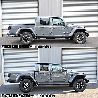 The Jeep Gladiator JT Starter System is a coil spring 1 & 2-inch lift designed around 37-inch tires for Rubicon models and 35-inch tires for non-Rubicon models (See fender and bump stop spacing recommendations below). This system is designed to be the most capable performance coil spring lift on a budget, with room to upgrade as funds allow. For more complete 2-inch lift systems, see the Stage 1 or Stage 2 systems.