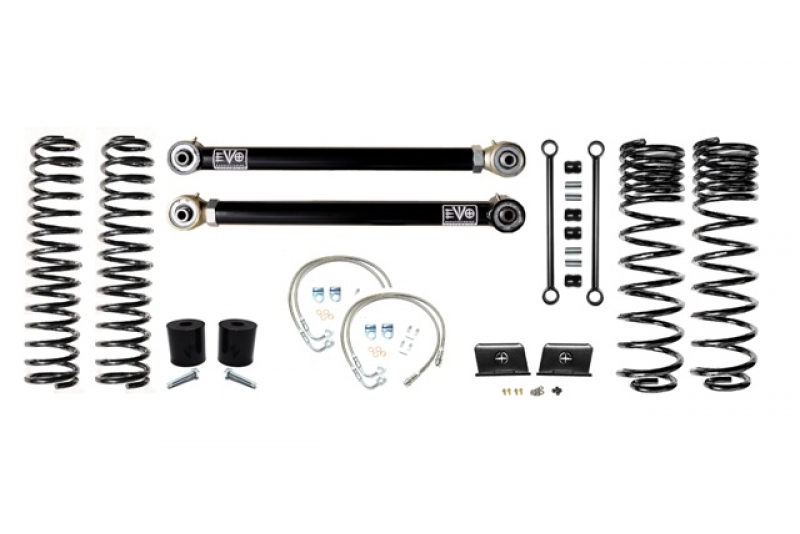 These kits come with a set of 2.5Inch lift springs specific to each corner which will keep the Jeep Gladiator JT level side to side. The EVO MFG 2.5Inch JT Enforcer Kits are easy to install using normal tools. No drilling or cutting. They require no driveshaft or exhaust modifications. Simple Bolt on installation. EVO MFG JT Enforcer kits are available in multiple configurations to suit your needs and budget and are upgradable down the road. Stage 1 kits includes all the necessary parts to lift your JT 2.5Inchs. Stage 2 kits includes Stage 1 components as well as EVO MFG Enforcer Front Lower Adjustable Control Arms to allow for caster adjustments. Stage 3 Kits includes stage 2 components as well as EVO MFG Enforcer rear upper adjustable control arms for rear pinion angle adjustment.