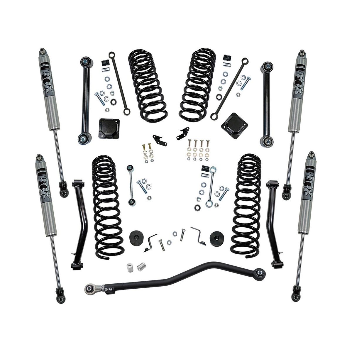 - Dual rate front and rear coils, adjustable front track bar, front and rear sway bar links, bump stops, rear upper control arms, brake line brackets, carrier bearing spacer, and either shock relocation brackets or FOX 2.0 shocks.