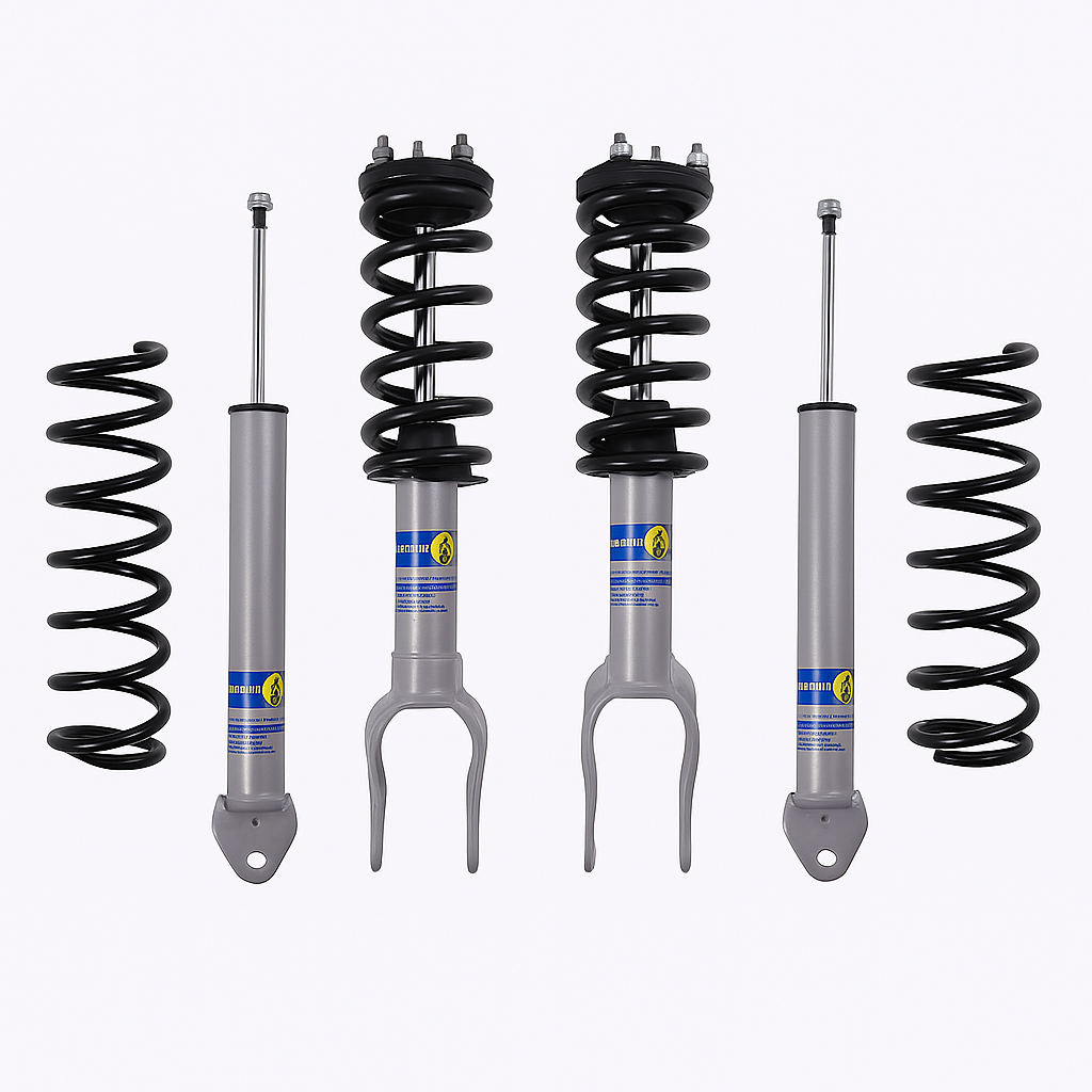 - Front (pre-assembled): 2 x Bilstein 5100 ride-height-adjustable coilovers with OE-replacement coils, new top mounts, bushings, isolators, and hardware