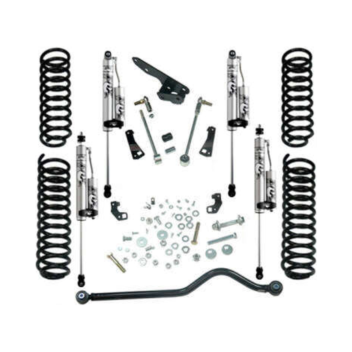 Included for the rear is a frame mounted track bar relocation bracket. This kit also includes replacement rear sway bar links, adjustable cam-bolts, brake line extension brackets and Superlift shock OR Fox 2.0 Shocks