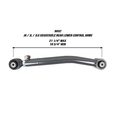 Our Synergy Jeep JK / JKU / JL / JLU Adjustable Rear Lower Control Arms fit seamlessly into your stock control arm mounts, providing a heavier duty option over stock. They are engineered to be stronger than stock control arms and bent to improve ground clearance, making them ideal to use in a lifted Jeep application. The included Synergy Dual Durometer Bushings drastically improve ride quality and stability over OEM bushings, improving your on and offroad experience and increasing longevity of the joints! Finished with a high-quality powder coat to prevent corrosion and rust and protect your investment, you will wish you had upgraded sooner.Â
