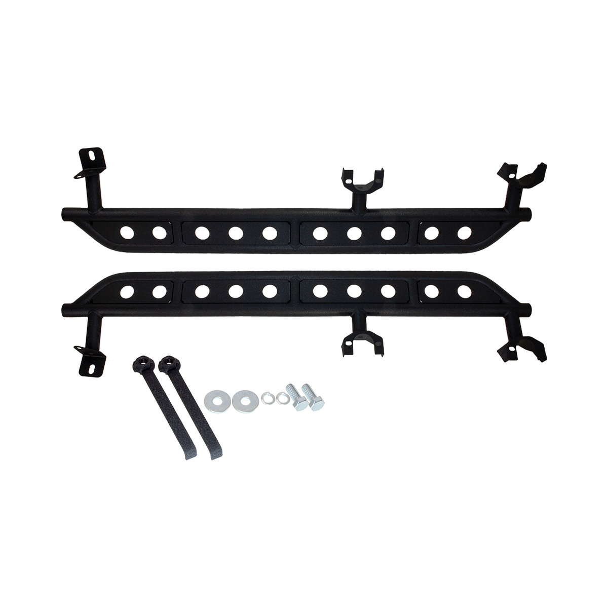 These mount to the underside of the Jeep using 3 mounting locations and provide you with protection on the trail and a step to help the family get into your Jeep.