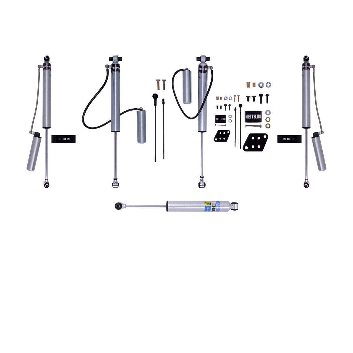 This kit includes the complete front and rear Bilstein shock set for the listed application. It also includes a steering stabilizer.