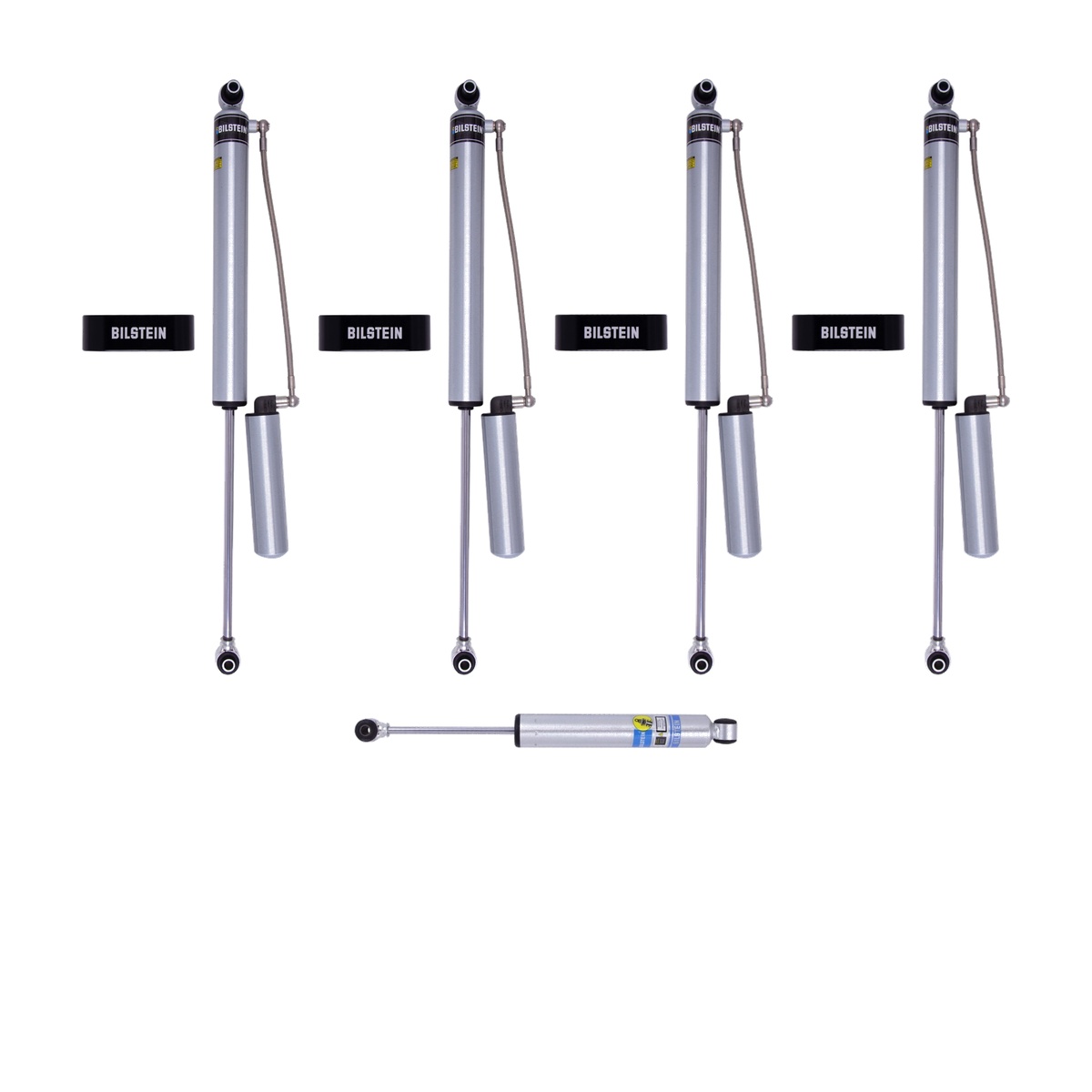 Summary: Bilstein B8 5160 3-4.5" Front and Rear Lift Shocks w/ Steering Stabilizer for 2018-2025 Jeep Wrangler JL 4Door 2WD/4WD is a front-and-rear Bilstein shock kit for the 2018-2025 Jeep Wrangler JL 4Door 2WD/4WD. It includes four shocks and a matching steering stabilizer and is intended for vehicles with 3-4.5 inches of front and rear lift.. Bilstein B8 5160 remote reservoir shock absorbers are designed as a direct-fit solution for lifted trucks and SUVs. The remote reservoir adds cooling capacity and wheel-travel support compared with a traditional shock absorber, while the monotube design and velocity-sensitive digressive valving stay application-specific.