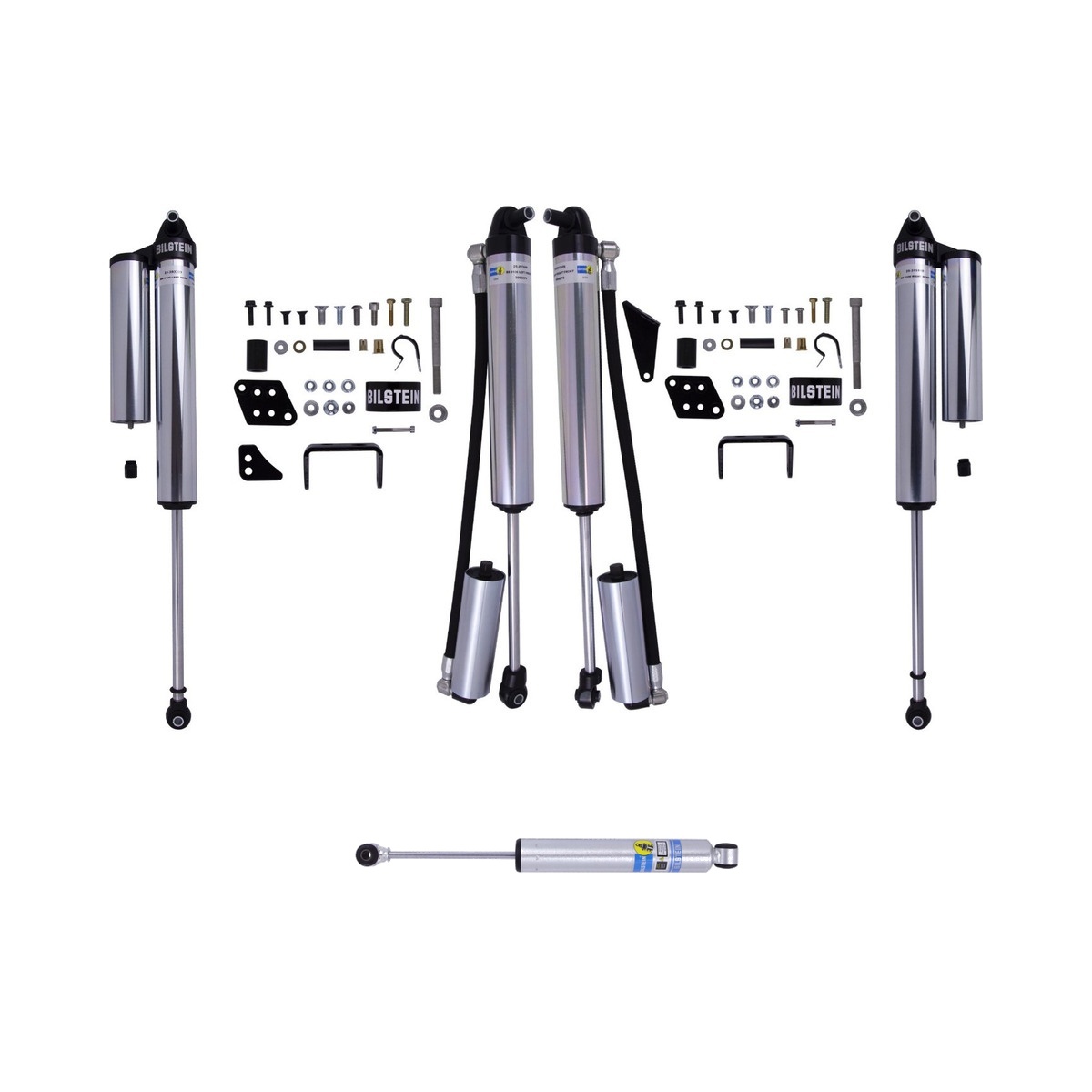 This kit includes the complete front and rear Bilstein shock set for the listed application. It also includes a steering stabilizer.