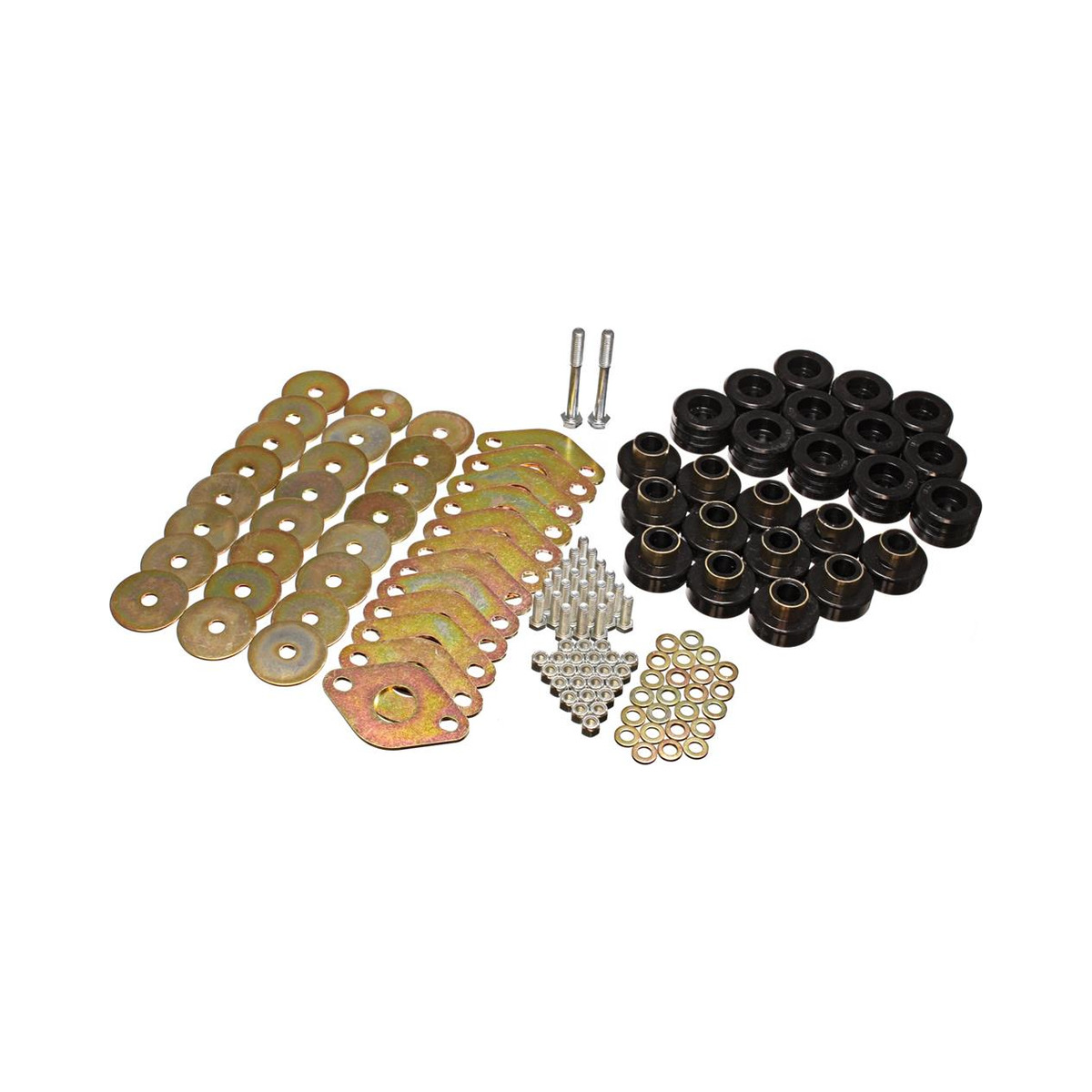 The Energy Suspension Body Mount Set fits 2007-2018 Jeep Wrangler. Key configuration details include Black Hyper-Flex performance polyurethane construction and Includes Hardware. It is designed to restore body-to-frame alignment with greater durability than stock rubber mounts.