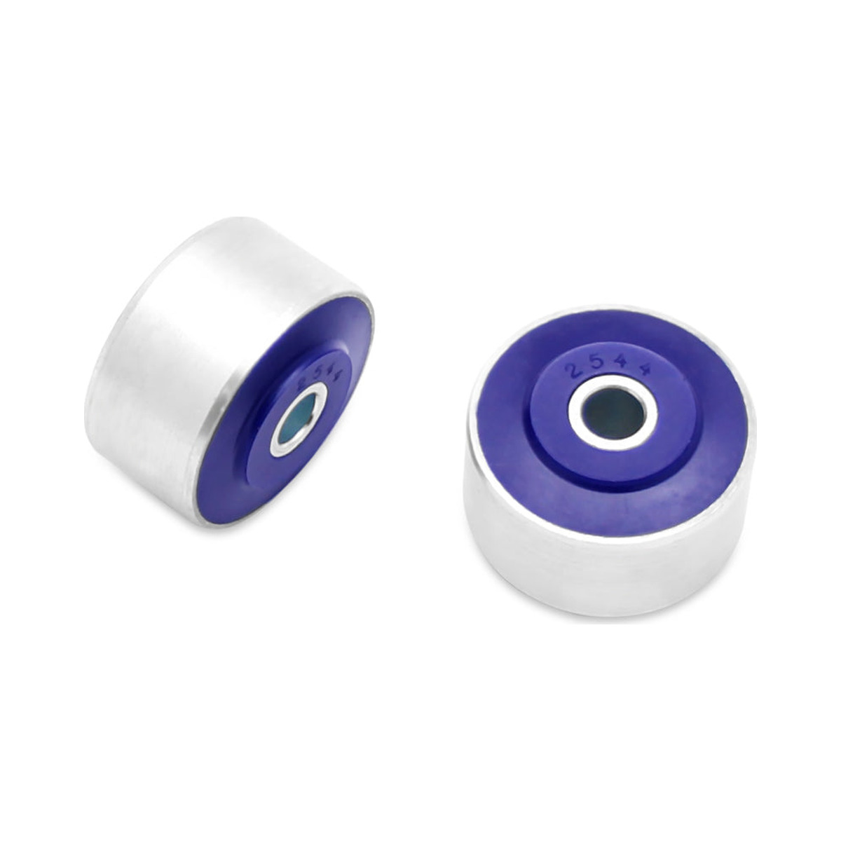 This kit replaces the rearward differential mount bushings that are located in the rearward of the two diff-supporting crossmembers. The OEM units are soft rubber and break down fairly quickly with that wear accelerated the harder they are used.