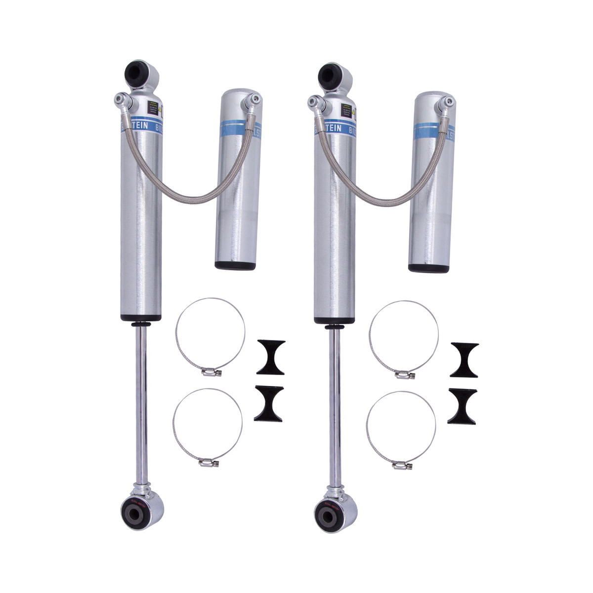 Bilstein B8 5160 remote reservoir shock absorbers are designed as a direct fit solution for lifted trucks and SUV’s. The remote reservoir will offer increased cooling capacity and wheel travel to optimize overall performance compared to a traditional shock absorber. These shock absorbers feature a monotube design for consistent fade free performance and utilize velocity sensitive digressive valve settings which are tuned for each specific application. Each shock absorber is fitted with a unique 360 degree swivel banjo hose fitting, providing a clean, low profile installation. B8 5160 remote reservoir shock absorbers will increase overall durability of your vehicle allowing you to conquer the harshest of off-road environments.