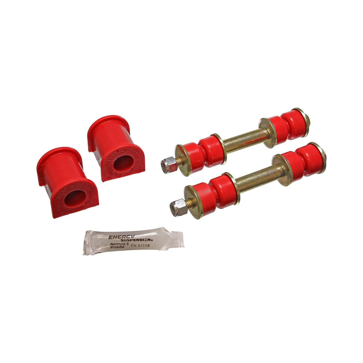 The Energy Suspension Front Sway Bar Bushing Set fits 1995-1997 Nissan Pickup. Key configuration details include Red Hyper-Flex performance polyurethane construction and Bar Dia. 20mm. It is designed to deliver tighter sway bar response and more consistent cornering feel.