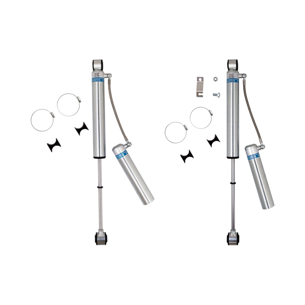 Bilstein B8 5160 remote reservoir shock absorbers are designed as a direct fit solution for lifted trucks and SUV’s. The remote reservoir will offer increased cooling capacity and wheel travel to optimize overall performance compared to a traditional shock absorber. These shock absorbers feature a monotube design for consistent fade free performance and utilize velocity sensitive digressive valve settings which are tuned for each specific application. Each shock absorber is fitted with a unique 360 degree swivel banjo hose fitting, providing a clean, low profile installation. B8 5160 remote reservoir shock absorbers will increase overall durability of your vehicle allowing you to conquer the harshest of off-road environments.