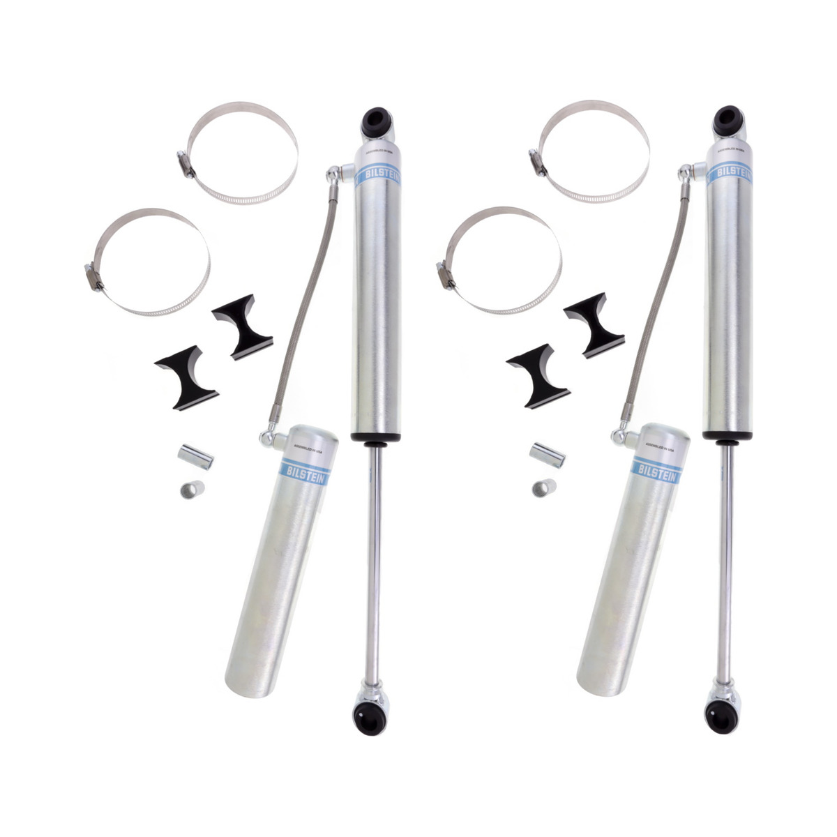 Bilstein B8 5165 remote reservoir shock absorbers are designed to be used on custom off-road vehicles in order to achieve the desired ride of your light truck or SUV. These high gas pressure monotube shock absorbers are sold by various lengths and valve rates to accommodate a wide range of uses and custom applications. All B8 5165 shock absorbers come equipped with 5/8 inch eyelets with hour glass bushings on both ends. The remote reservoir will offer increased cooling capacity and wheel travel to optimize overall performance compared to a traditional shock absorber. Each shock absorber is fitted with a unique 360 degree swivel banjo hose fitting, providing a clean, low profile installation. B8 5165 remote reservoir shock absorbers will increase overall durability of your custom vehicle allowing you to conquer the harshest of off-road environments.