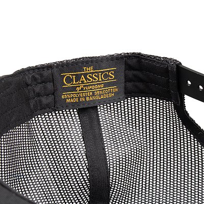 60% cotton / 40% poly with a 100% poly mesh back (black/grey hat)