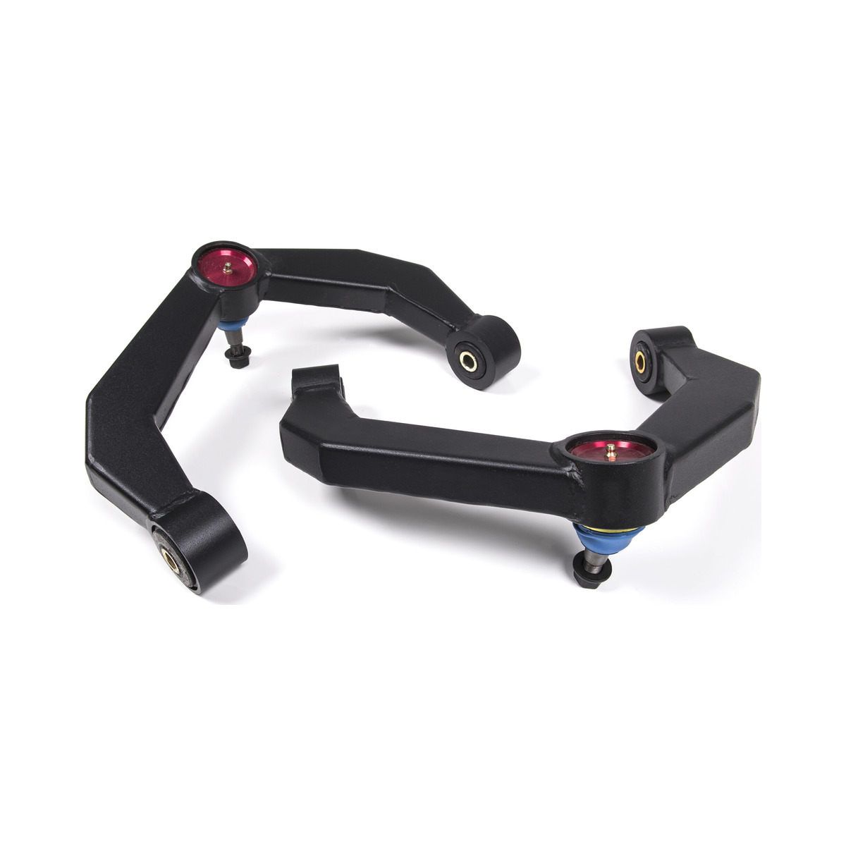 Upgrade your truck’s factory upper control arms with these high strength Adventure Series control arms from Zone Offroad. These arms are a direct replacement to improve strength and increase suspension droop travel. These arms are built from high strength steel, boxed, gusseted and fully welded for strength and rigidity. At the frame mount they use OE style rubber bushings for a long service free life and quiet operation. At the other end these arms feature an indexed ball joint cup designed for use with leveling and lifted applications. High strength ball joints are used with a protective ball joint cap to keep debris out. These upper control arms come fully assembled and ready to bolt in right out of the box.