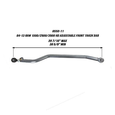 The Synergy 1994-2013 Dodge Ram 1500 / 2500 / 3500 Adjustable Track Bar is a critical component to correcting axle placement and achieving ideal suspension geometry after installing a suspension lift. Manufactured from 1.50″ USA made DOM steel, this track bar significantly improves lateral stiffness and strength over stock to hold up to the abuse of large tires and aggressive offroad driving. This track bar can be adjusted 0.25″ shorter than stock to account for truck pulling, and race applications where the truck may be lowered up to 3″ Â from stock .