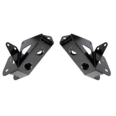Synergy radius arm drop brackets improve ride quality by lowering the radius arm mounting locations at the frame to maintain factory front suspension geometry for leveled and lifted trucks. Flip-able cam spacers in the drop brackets allow the user to run the axle 1/2 inch forward for leveled trucks or 1-1/2 inches forward to clear larger tires and taller lifts.