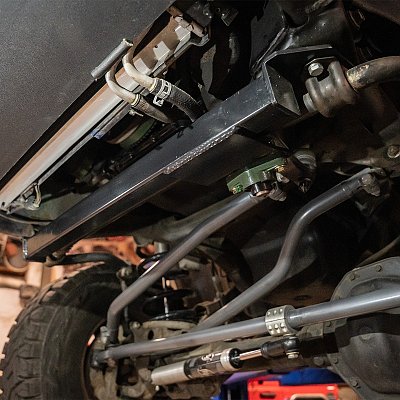 If the vehicle is equipped with a sway bar drop bracket from a suspension lift, the Synergy Steering box brace must be installed between the frame rail and the sway bar drop bracket