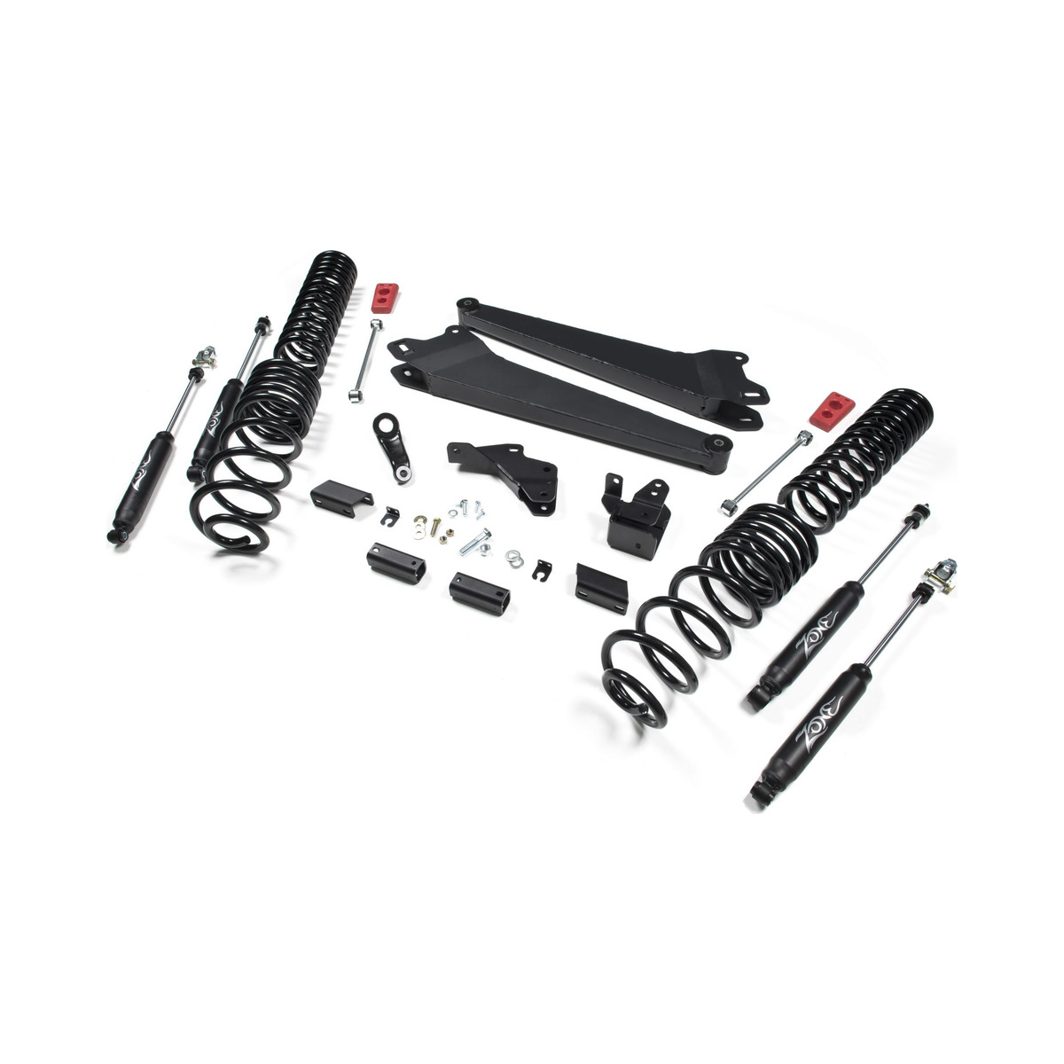 - Front lift includes 4″ coil springs, high clearance radius arms, track bar bracket, pitman arm, sway bar correction, bump stops, brake line brackets, Bilstein shocks, and all required hardware