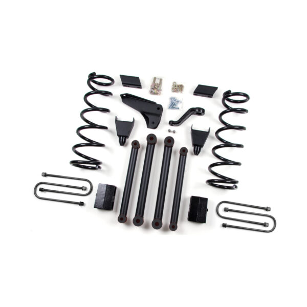 This Zone Offroad 4-link system replaces the weak upper and lower factory control arms with greasable DOM tubular arms. The arms mount in the factory control arm pockets for a completely bolt on easy installation that aligns to factory specs. Zone Offroad has engineered their coil springs for a comfortable ride on both gas and diesel trucks. Optional: black nitrogen gas charges shock for that performance handling feel are available from drop down menu. To correct the steering geometry and keep your axle centered, the kit includes a dropped pitman arm and 1/4″ thick fabricated track bar bracket that you will not be disappointed with! The kit also includes sway bar drop brackets and if you get serious, taller bump stops. The rear is lifted with 3″ blocks to give your truck a more level stance and make for a quick installation.